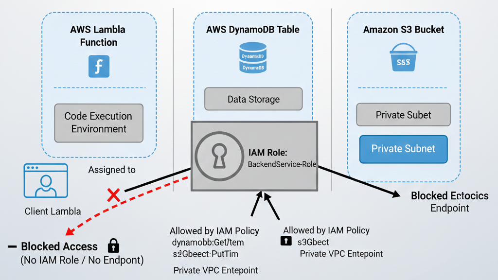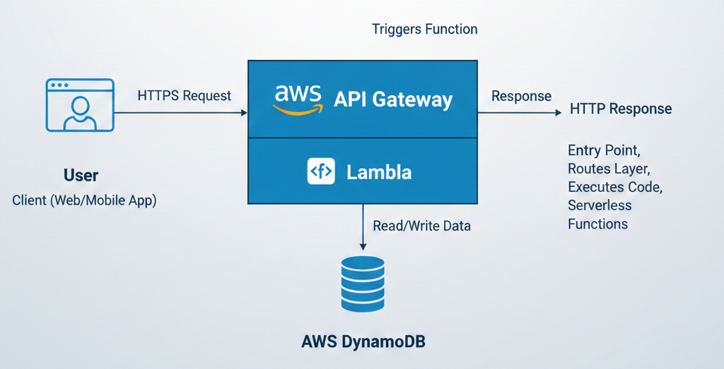 Answer: A serverless architecture uses Amazon API Gateway to receive requests and invoke AWS Lambda functions. Lambda automatically scales across multiple availability zones. For data storage, services like Amazon DynamoDB or Amazon Aurora Serverless provide built‑in high availability. Security is enforced using IAM roles and encrypted data storage. This design eliminates infrastructure management while maintaining resilience and scalability.