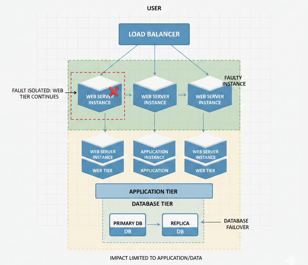 Answer: Fault isolation focuses on preventing failures in one component from impacting others. In a typical design, the web, application, and database tiers are placed in separate subnets with independent scaling policies. Security groups restrict communication between tiers, and routing ensures controlled traffic flow. Using services like AWS Lambda or Amazon SQS between tiers can further decouple components. This approach allows individual layers to fail or scale without affecting the entire system.