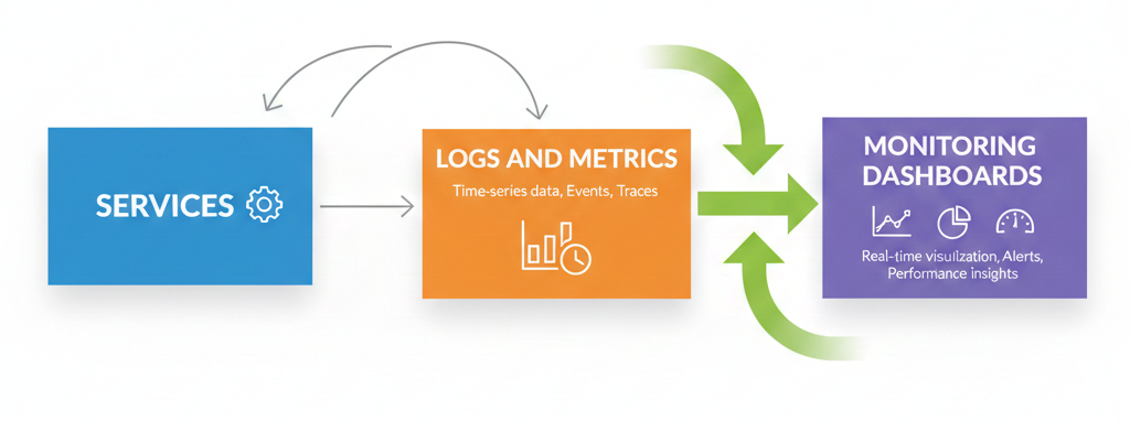 Answer: Observability involves logs, metrics, and alerts across all layers. Amazon CloudWatch collects metrics and logs, while CloudTrail tracks API activity. Alarms notify teams of anomalies, and dashboards provide real‑time visibility. Designing observability into the architecture helps detect issues early and improves operational reliability.