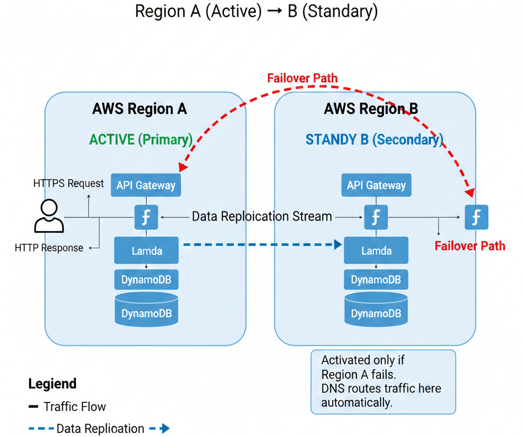 Answer: In a multi‑region design, the primary region hosts the active workload, while a secondary region is kept on standby. Data is replicated using services such as database replication or cross‑region storage replication. Traffic routing services like AWS Global Accelerator or DNS‑based routing direct users to the healthy region during failures. This architecture minimizes downtime and supports business continuity requirements.