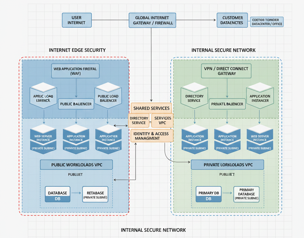 Answer: In secure cloud design, only internet‑facing components are placed in public subnets. Internal services and databases remain in private subnets with no direct internet access. Outbound connectivity is handled through NAT gateways. AWS IAM controls identity access, while encryption is applied using AWS KMS. Monitoring is enabled using AWS CloudTrail and Amazon CloudWatch. This layered security pattern protects sensitive workloads while still allowing controlled external access.