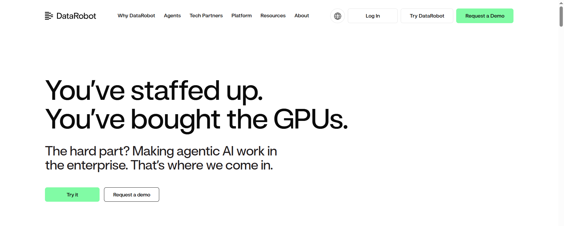 DataRobot automates the hardest parts of machine learning — feature engineering, model selection, tuning, deployment, and monitoring. Fortune 500 companies trust it to build ML models at scale.