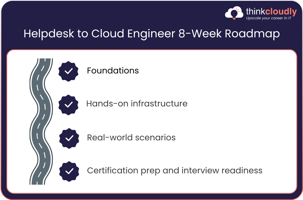 Free resources on YouTube and blogs can absolutely teach you the cloud eventually. The problem isn’t the information. The problem is sequence, accountability, and time. Most self-learners spend six to nine months piecing together what a structured path delivers in eight weeks, because they don’t know what to learn next or when to stop one topic and move to another. And by month four, life gets in the way, and they quit.