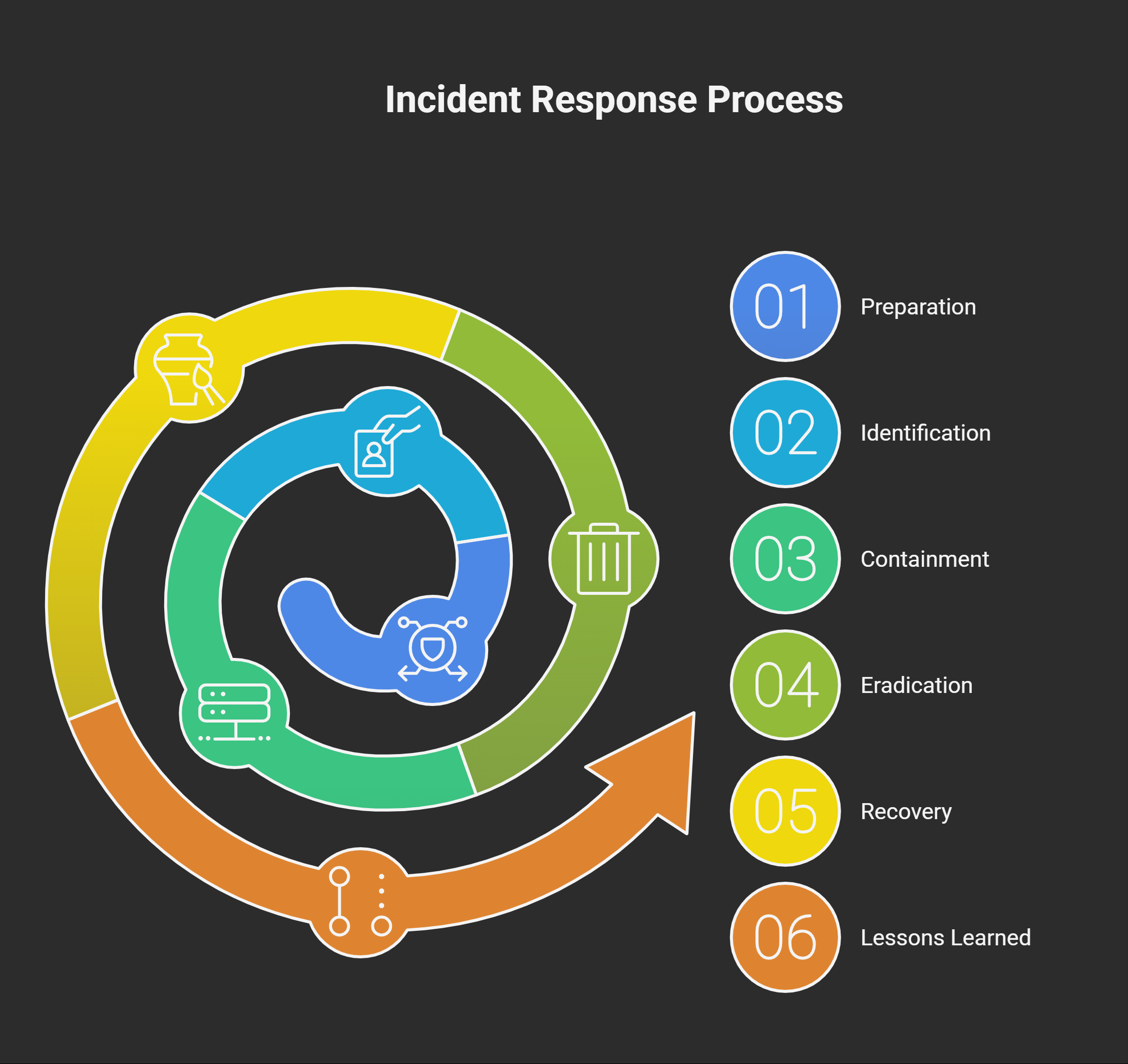 - Lessons Learned: Document the incident, analyze failures, and improve processes, playbooks, and security controls for the future.