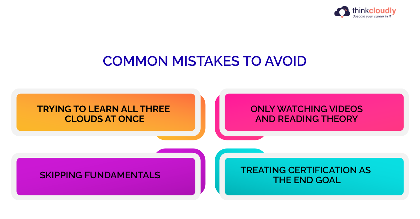 Mistake 1: Trying to learn all three clouds at once: This leads to surface-level knowledge and no real depth anywhere. Pick one. Get certified. Then expand.