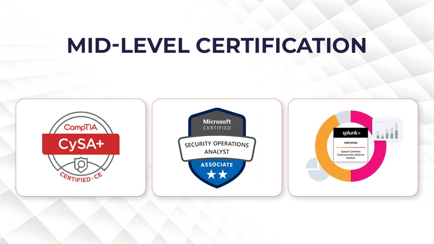 After completing entry-level SOC training or gaining some basic experience, mid-level certifications can help advance your career by strengthening your technical abilities. The advanced threat detection, incident response, forensic analysis, and SIEM-based investigation skills needed for SOC L2 and L3 positions are the main focus of these certifications.