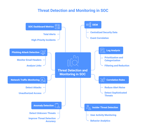 In today’s cyber world, threat detection and monitoring are critical responsibilities of a Security Operations Center (SOC). SOC analysts work tirelessly to detect, analyze, and respond to security incidents in real time. In this blog, we’ll explore the core aspects of threat detection and monitoring, dive into key SOC practices, and include common interview questions with answers that can help you land your next SOC role.