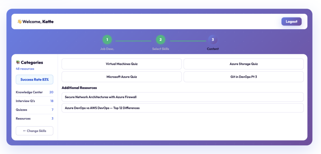 Resources across categories — Knowledge Center, Interview Questions, Quizzes — all mapped to your selected tags. Nothing irrelevant.
